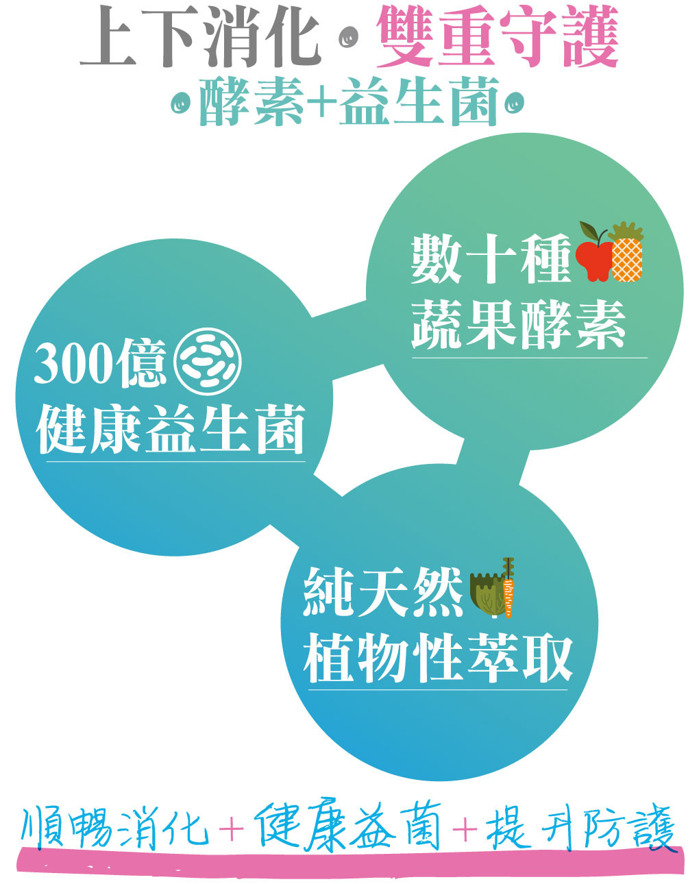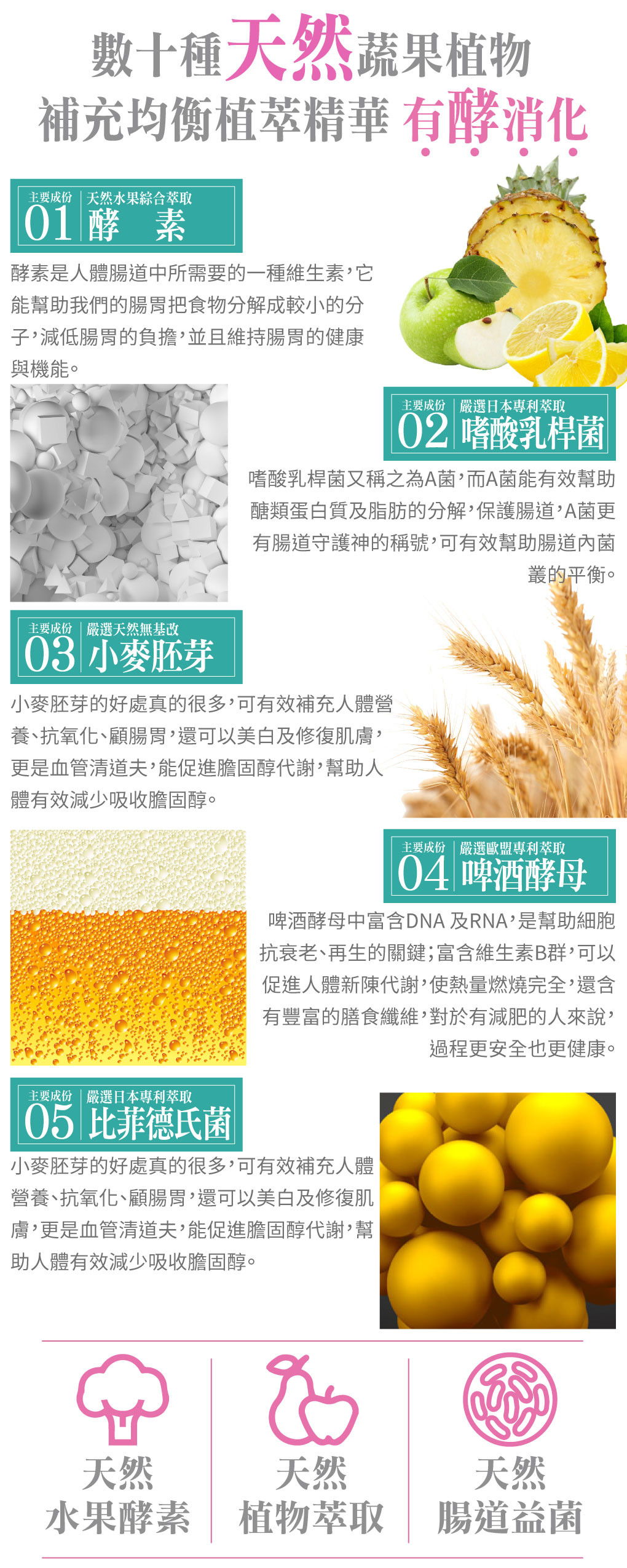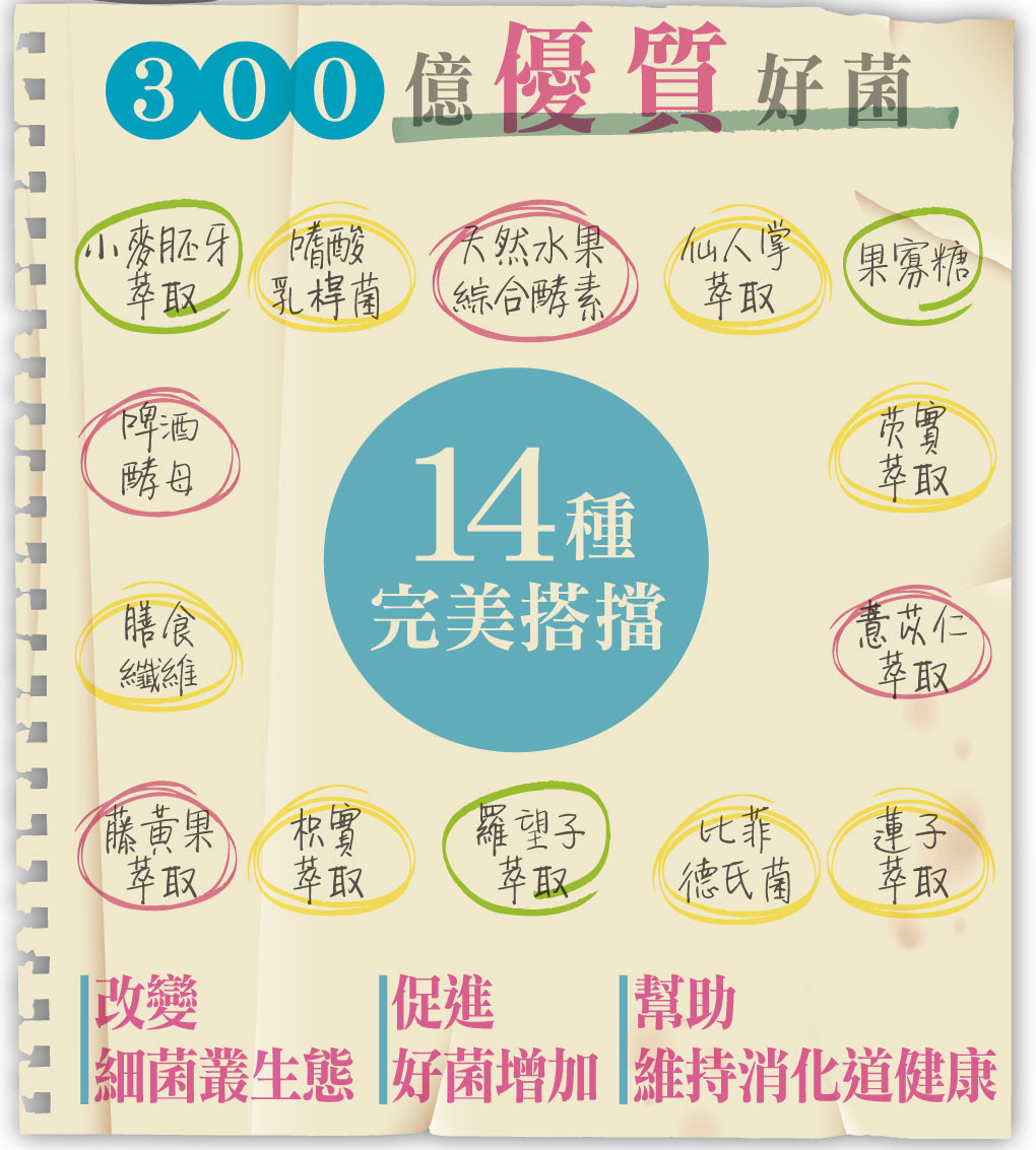 成分:嗜酸乳桿菌,馬鈴薯澱粉,菜豆粉,小麥胚牙粉,啤酒酵母,膳食纖維,藤黃果,枳實,羅望子粉,比菲德氏菌,乳糖,蓮子粉,薏苡仁粉,芡實粉,甘草粉末,果寡糖,綜合酵素,仙人掌萃取,水果粉