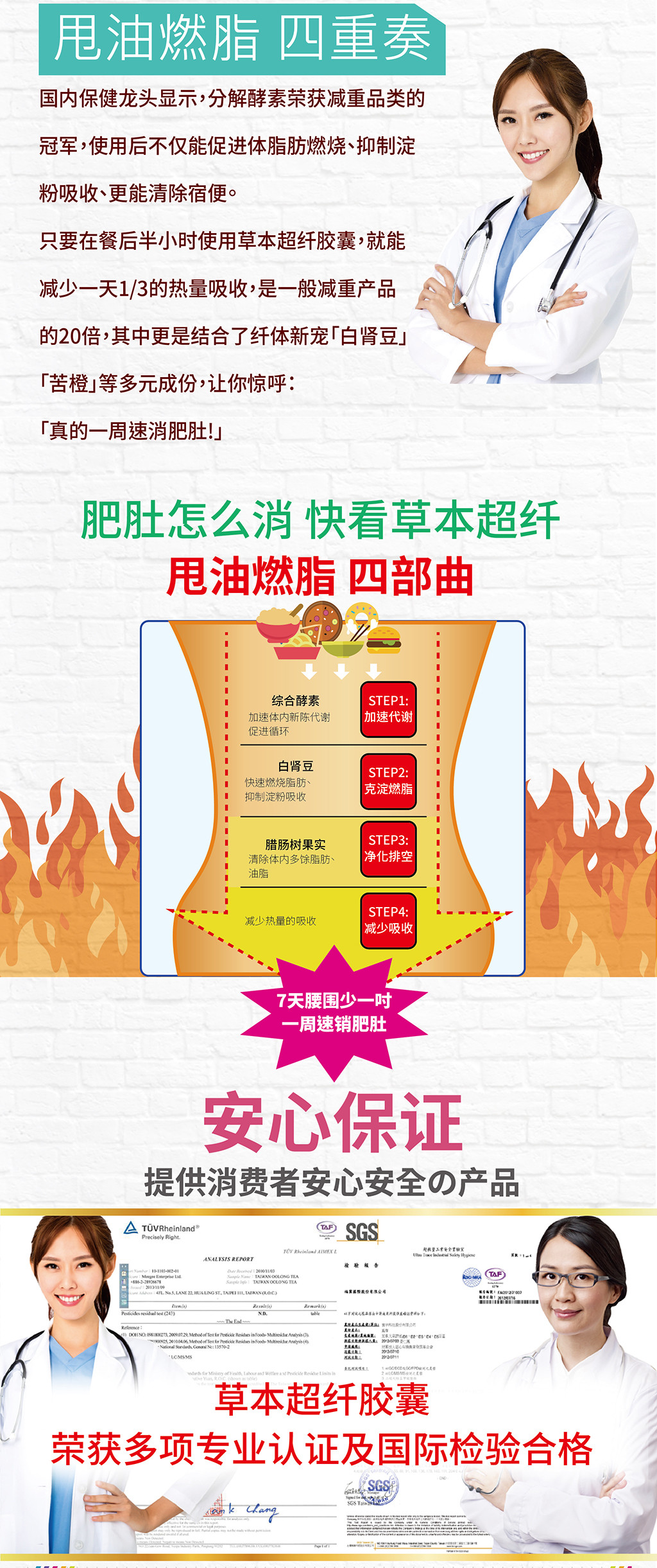 成 分:綜合酵素(含澱粉分解酵素、脂肪分解酵素、纖維分解酵素)、益生菌(嗜酸乳酸桿菌、龍根菌、比菲德氏菌、芽孢乳酸菌)、玉米來源可溶性纖維、紅花籽萃取物(含CLA)、白腎豆、綠茶萃取(含兒茶素)、臘腸樹果實、植物甲殼素(菇蕈來源)、植物性膠囊